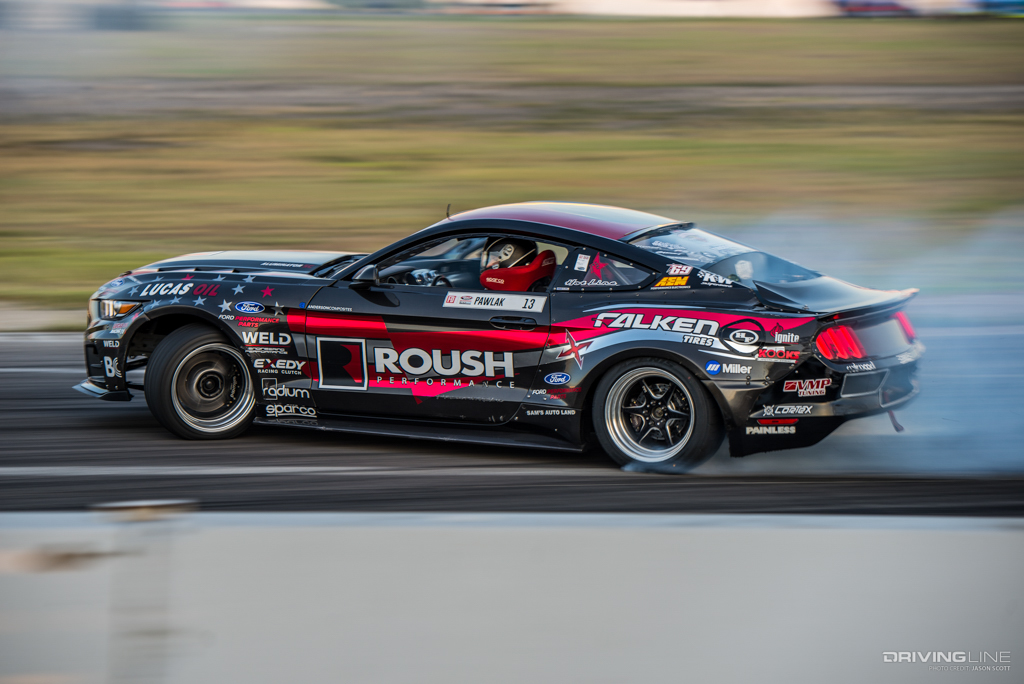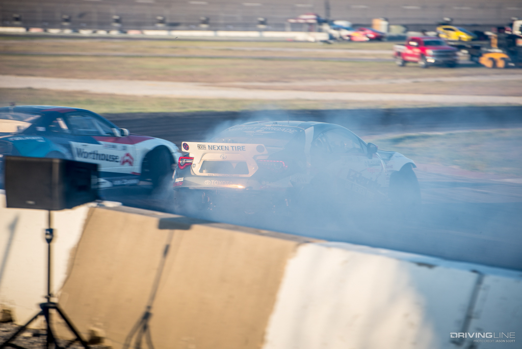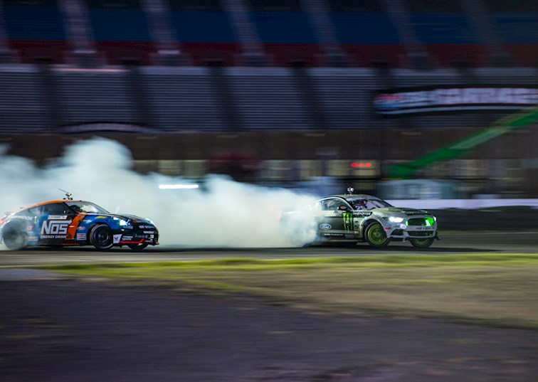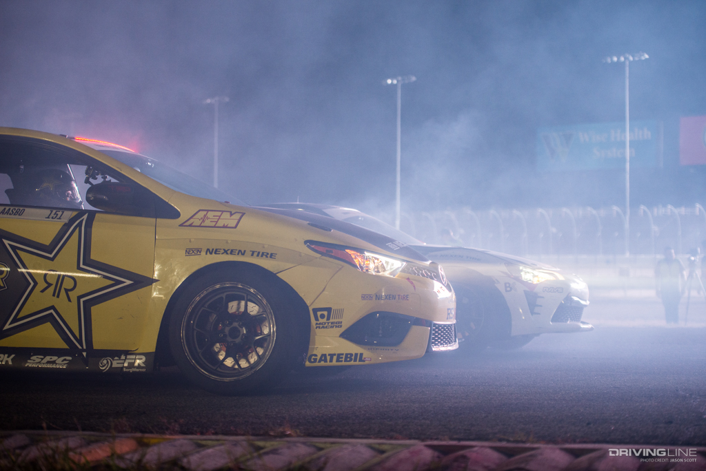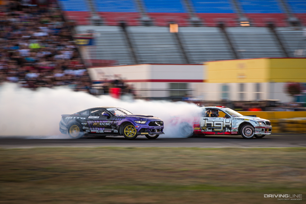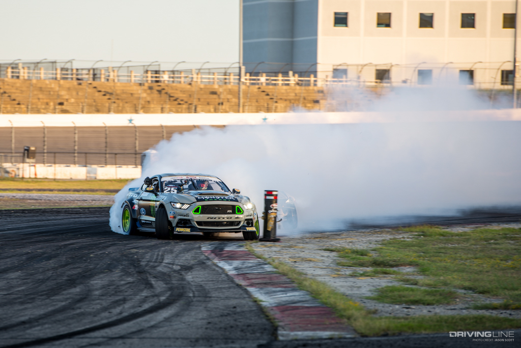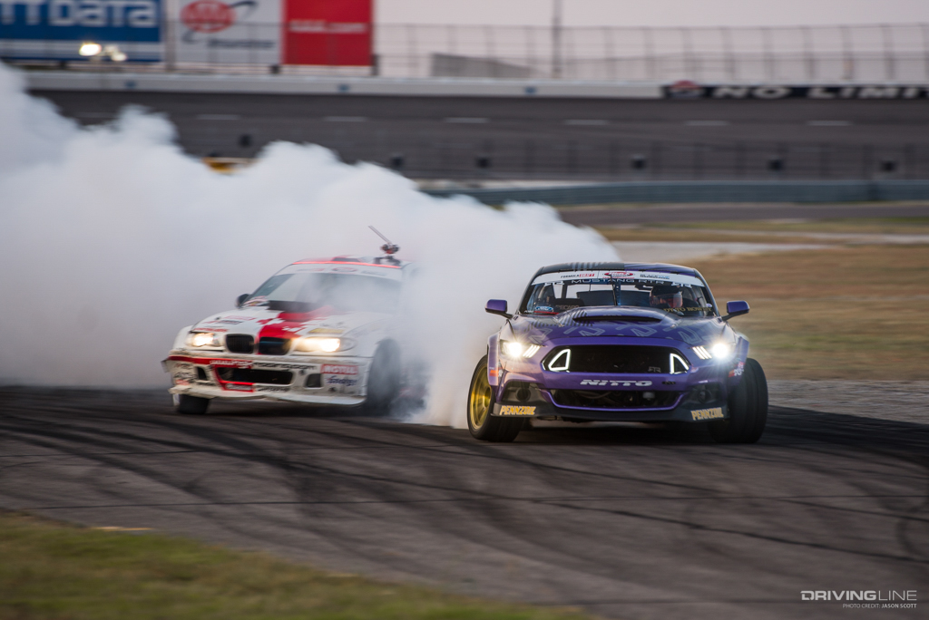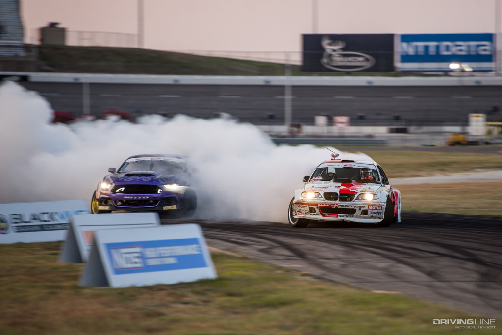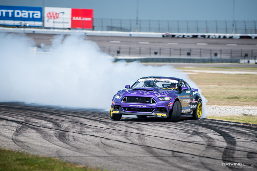 Formula Drift took over Texas Motor Speedway for a weekend of intense competition. Nitto Tire/Mustang RTR teammates Vaughn Gittin Jr. and Chelsea DeNofa (#BroStangs) made it to the Great 8, but it was their tandem competitors who advanced to the final rounds and an eventual podium. Although Chris Forsberg put forth an amazing run in the Final Battle, it was James Deane who claimed the first-place title by the end of the night.