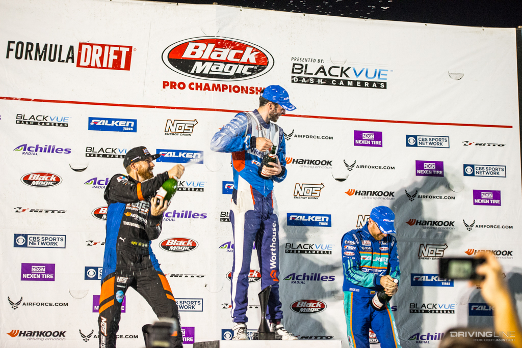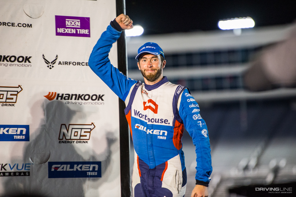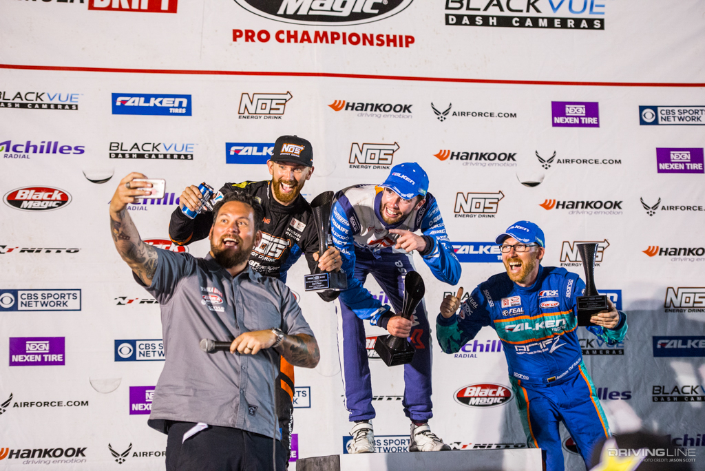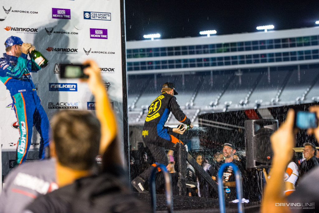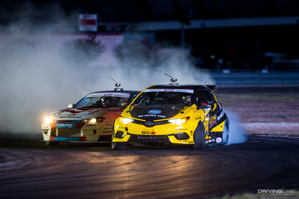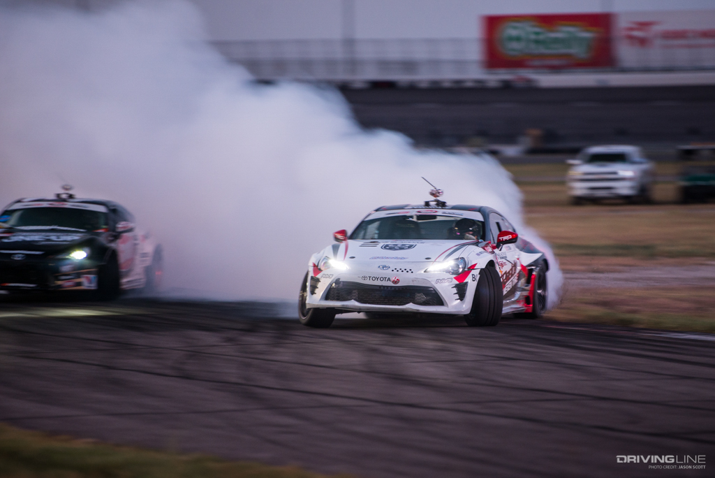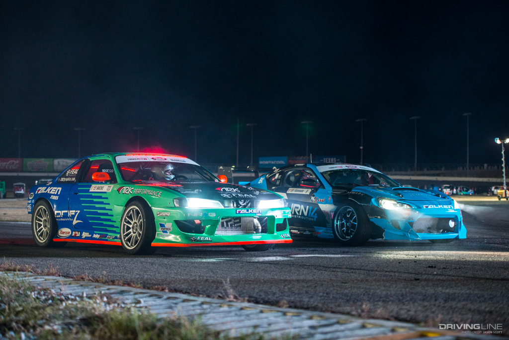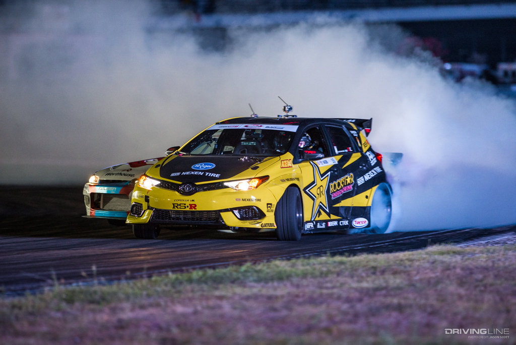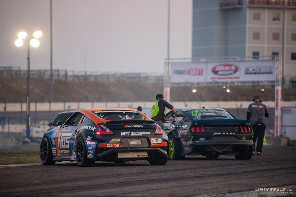 Formula Drift took over Texas Motor Speedway for a weekend of intense competition. Nitto Tire/Mustang RTR teammates Vaughn Gittin Jr. and Chelsea DeNofa (#BroStangs) made it to the Great 8, but it was their tandem competitors who advanced to the final rounds and an eventual podium. Although Chris Forsberg put forth an amazing run in the Final Battle, it was James Deane who claimed the first-place title by the end of the night.